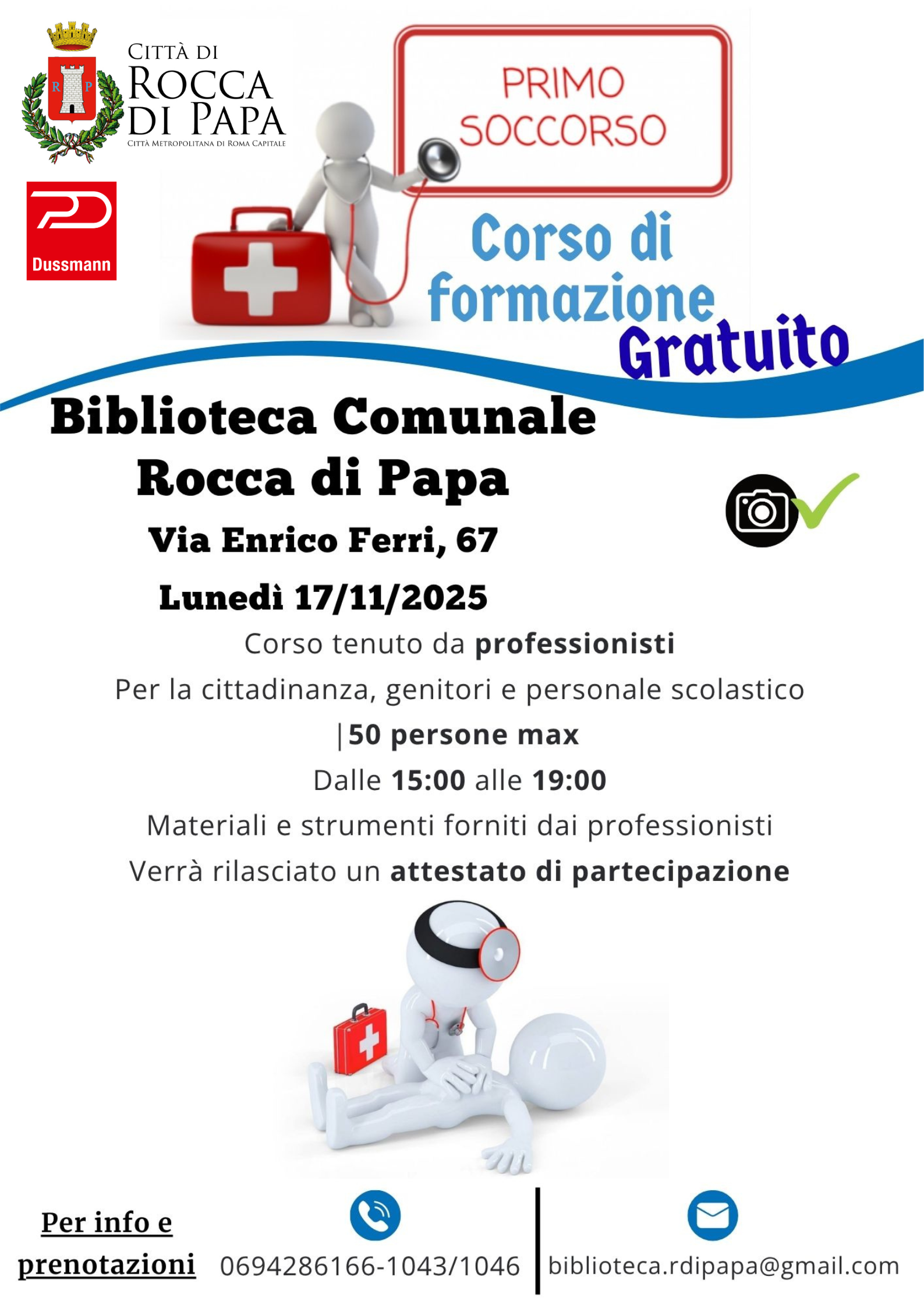 L’amministrazione Comunale, in collaborazione con la Dussmann Service, propone un corso di primo soccorso gratuito che si terrà il giorno Lunedì 17 Novembre, dalle ore 15:00 alle ore 19:00, presso la Biblioteca Comunale in Viale Enrico Ferri n 67.